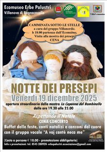 L’evento in programma venerdì 19 dicembre prevede l'apertura straordinaria della mostra dei presepi dalle ore 19.30 alle 23.00, col la partecipazione di un coro femminile “A voj cantè neca me” che allieterà il momento conviviale con canti di Natale e canzoni del cuore, presso la Locanda dell'allegra mutanda, sala conviviale dell'Ecomuseo.